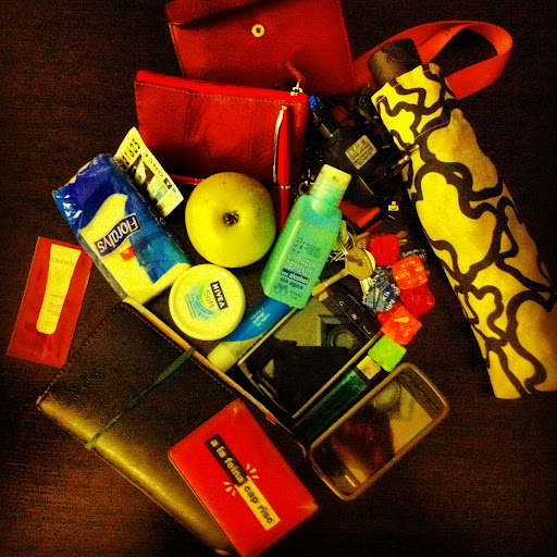 | Yo, la cotilla, llevo Kleenex, polvos y vaselina de Bobbi Brown, mi iPhone, mini agenda, muestras varias, bolis, algún que otro ticket de la compra, mi cartera, mis gafas Ray-Ban, chicles… Smint…? |